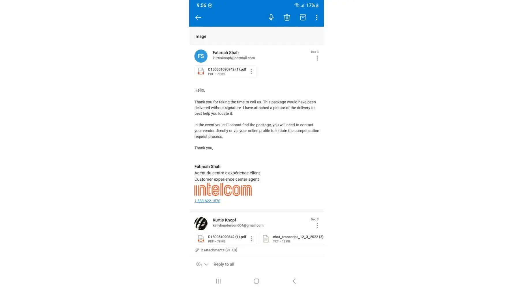Dec 19 - Intelcom email message - package has been delivered. Proof of delivery = outside picture of our lobby doors with concierge sitting inside, NO PACKAGES in photo and none delivered. No attempt to get concierge's attention.