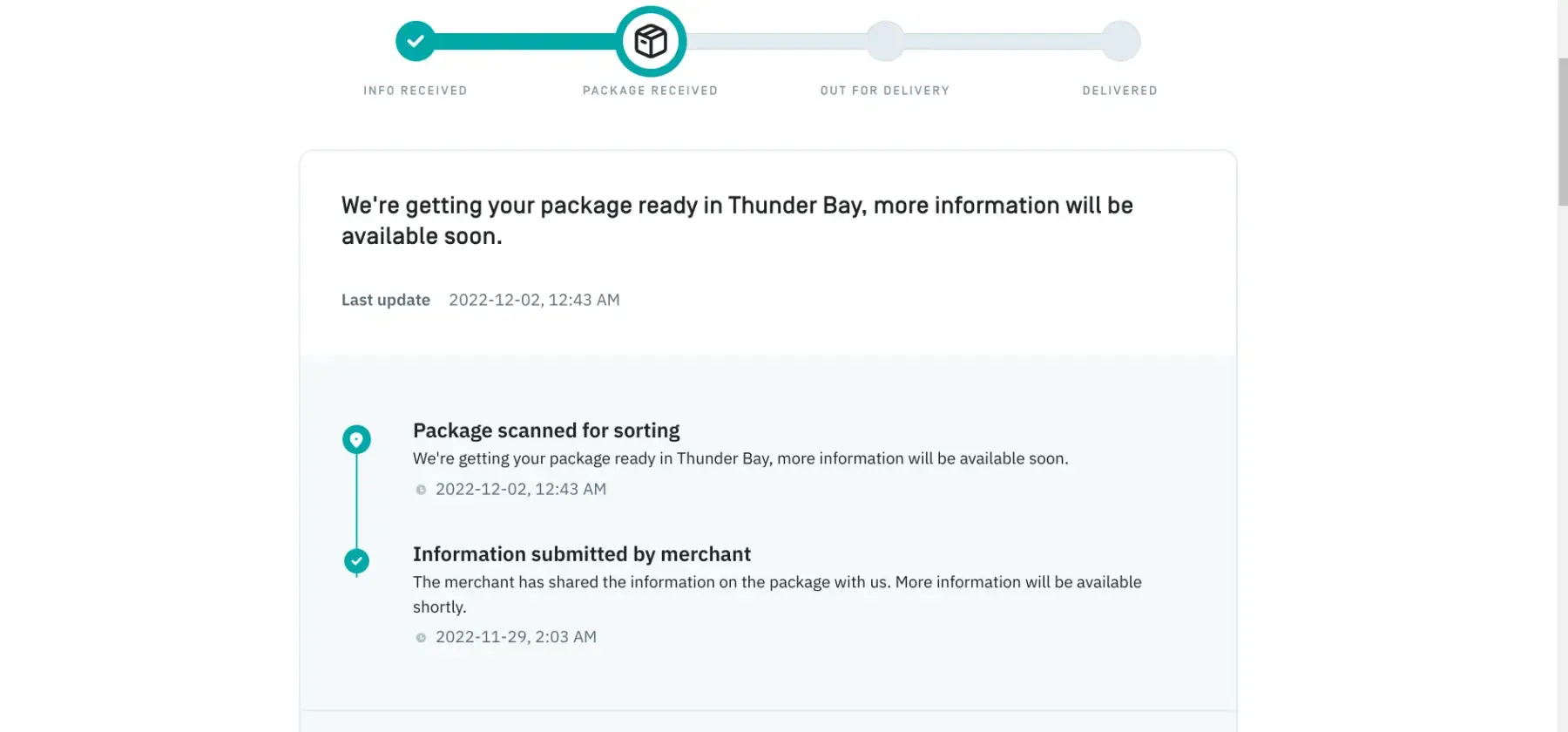 On December 9, 2022 I went onto Amazon Canada website to check on the status of my package and when I clicked track it said my package was delayed or lost. I copied the tracking number and went into intelcom website to track the package and it showed that the package had been received in Thunder Bay Ontario December 2, 2022 at 12:43 am but after that nothing else has changed and it is December 13, 2022. I live in Kenora Ontario which approx 6/12 hours away from Thunder Bay so it still had farther to come. I was reimbured by Amazon however the items I ordered where Christmas gifts I could not get anywhere else but Amazon and due to delivery could not order again as they would not arrive in time. I have had nothing but issues with intelcom with packages arriving very late. This is the first time I've put in a complaint but anyone else who has ordered from Amazon and used intelcom that I have spoken to is in the same boat with late or lost packages or packages being carelessly delivered and put in strange areas at their residents. I have been in contact with Amazon and complained to them about you also and told them I not sure if I can use Amazon anymore if Intelcom is involved. I make numerous purchases a year through intel come.