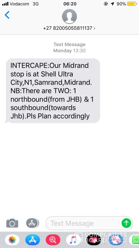 I was set to take the bus to Middleburg at 05:55 on the 30/08/2019, the instructions stated to be ready at the Shell Ultra City N1 (Samrand) garage by 05:25 - with no instruction as to whether they meant Southbound or Northbound. After waiting from 04:15 until 06:10 there was no sign of the bus, I was informed by inquiries that the bus was at the garage on the other side of the highway (Southbound). They also stated that my ticket states which garage to be at HOWEVER there is NO INDICATION whatsoever as to which garage I should be at (as seen below). The communication at Intercape is pathetic and vague, I will not be making use of their services in the future.
