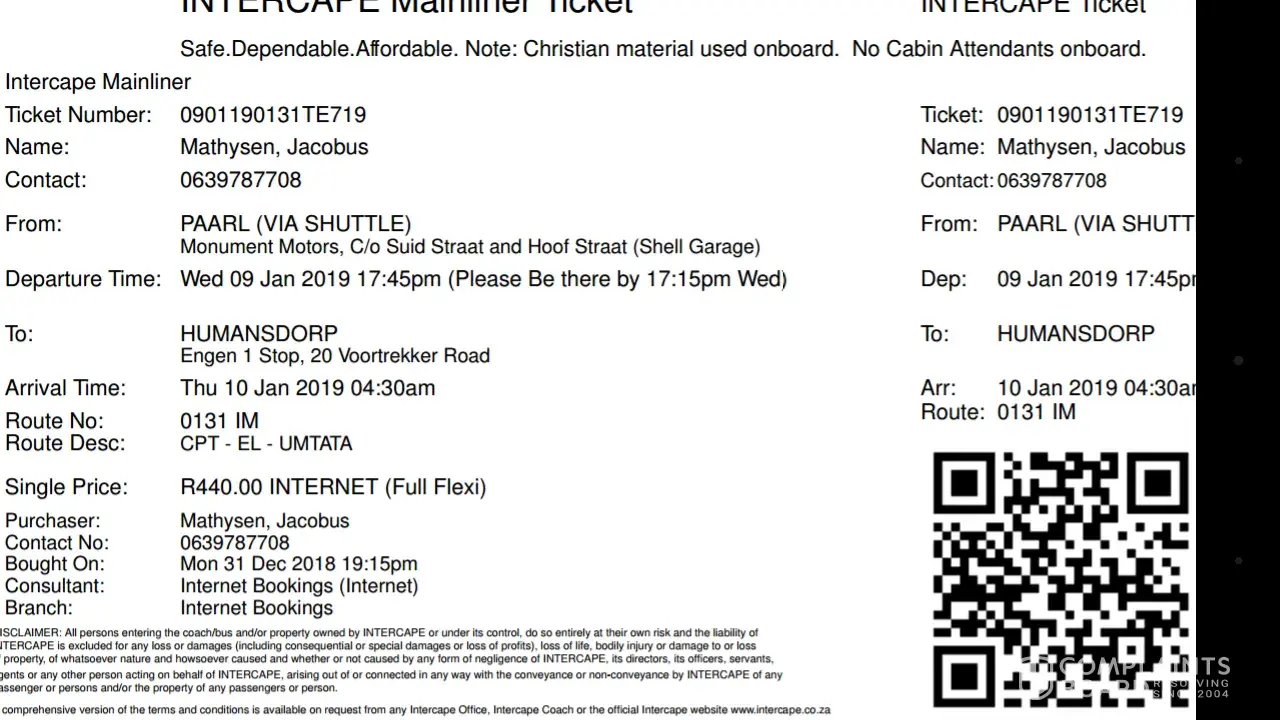 I am extremely unhappy with the service intercape offered me on my trip from paarl to humansdorp. First we get to somerset west, then there is something wrong with the bus. So they bring another bus after standing a hour min waiting. The bus gets there then we are off. We get to riviersonderend and then the bus gives also some kind of trouble. Because of this I am gona miss a very important job interview tommorrow because of intercape failure to live up to their slogan. Safe yes, dependable no, affordable yes. Extremely dissapointed. I insist that intercape reimburses me for my ticket and give me a voucher. On the bus intercape shows of all the inspections that is done on a bus before it departures.. Clearly thats not the case..
