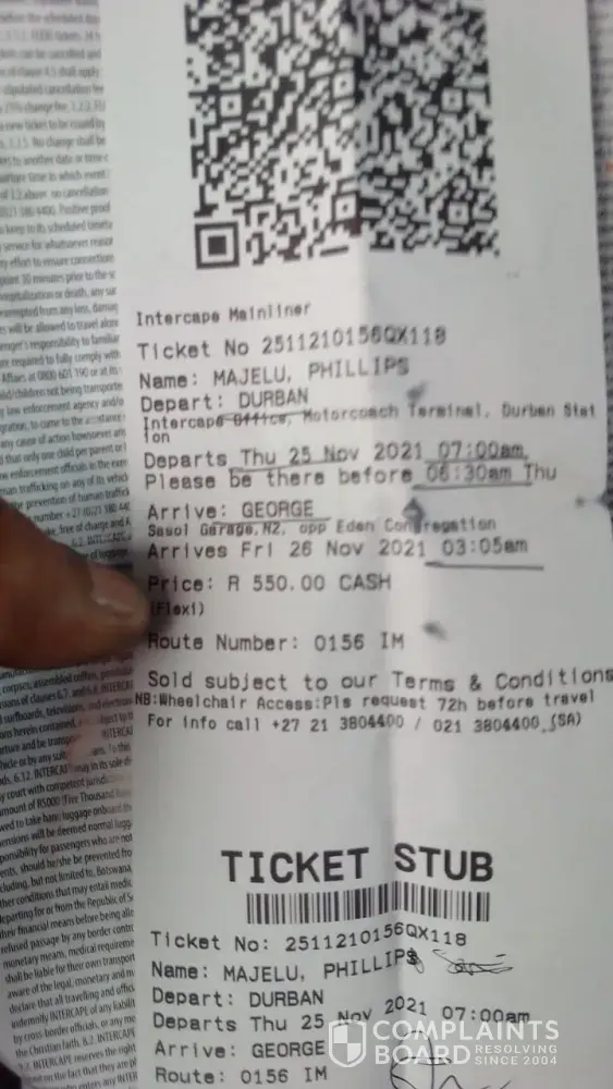 My aunt bought me and my two small children bus tickets from intercape through shoprite. From Bethlehem to Amanzimtoti for the 02 December 2021. The bus arrived late and on arrival the bus driver climbed out of the bus and asked whom he was picking up, me and my boyfriend told him it was me and the 2 children which was already asleep as it was past midnight he then proceeded to tell us that the children should be awake as we knew the bus was coming. He asked where my laggage was and through it in the compartment on the side of the bus without marking my luggage. As we rushed to the enterance of the bus as he told us he was late and did not have time to wait for us he grab my 4 year old son and walk up the stairs to the front of the bus, there was 2 seats open but them told me children are not allowed to sit at the front of the bus, he then picked up my son and proceeded to move deeper into the bus and them chased another passenger out of a seat and told me and my boyfriend that me and my children would sit here, i told him that it was only 2 seats and we payed for 3 but he just waved his hand and moved to the front of the bus. My boyfriend was helping me to get the children comfortable when the driver just took of and my boyfriend ran to the front of the bus to stop the bus as he still had to get off the bus. The driver told him that he is waisting his time and my boyfriend got off and the driver took off over the pavement. I have never been so scared in my life. The driver drove really fast and reckless for a while my son slept on me but he was uncomfortable so i had to sit on the floor. When we stopped at Montrose the passengers complained that the toilet was overflowing and he told them to wait until we got to Durban. I have since phoned [protected] twice the first time i spoke to a lady, whom i unfortunately did not get her name, took my number and a lady with the name Jessica would call me back, nobody phoned me. The second time was a few days later i phoned again and a Tasmiha told me Jessica was busy and would phone me back i have not heard anything frrom them. My boyfriend logged a complaint on the 03 December 2021 Reference number C132864. The ticket numbers is as follow :
