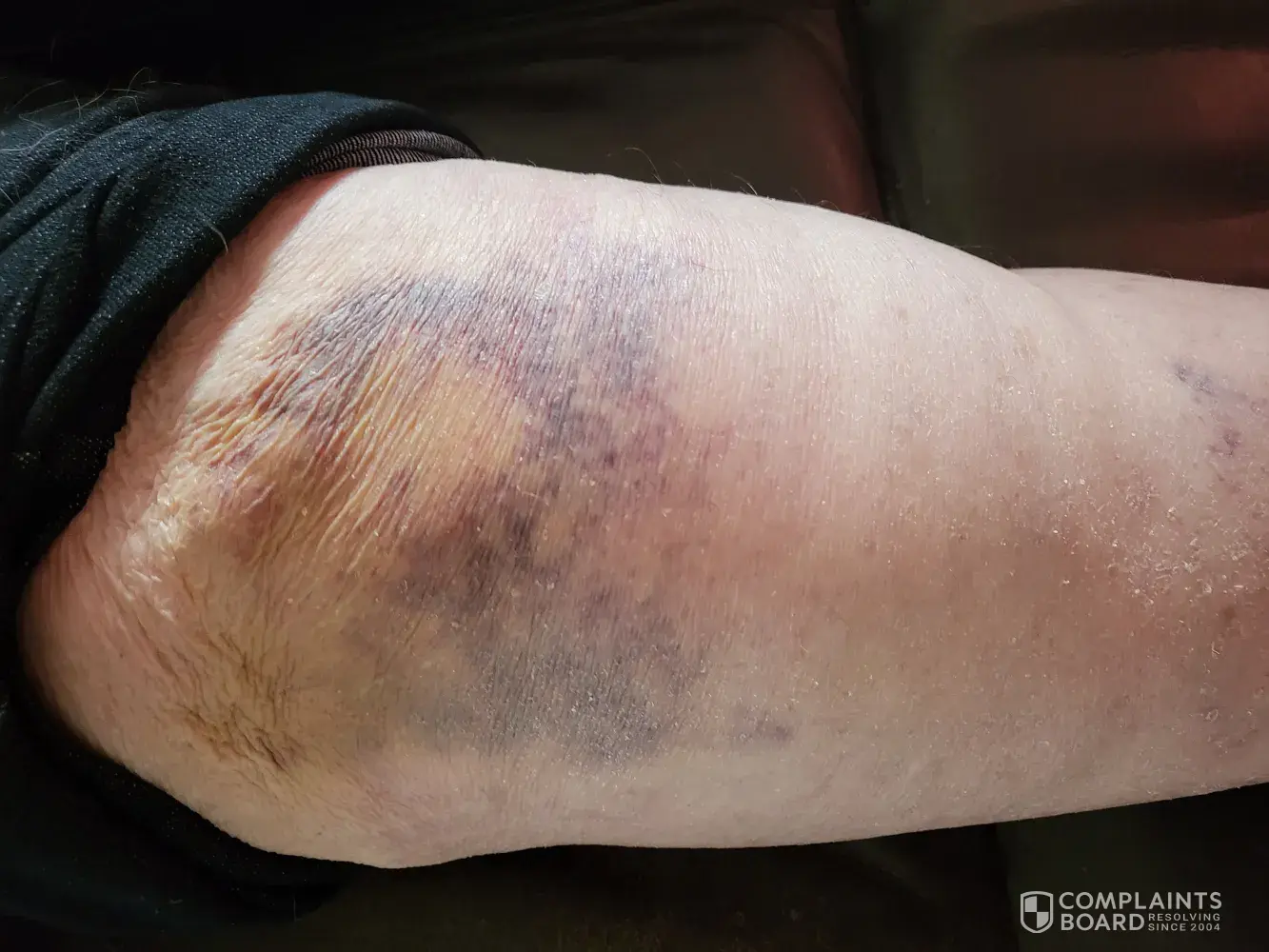 Absolutely no assistance was given and my mom was eventually helped by some fellow travelers. At the transfer point she tried to get into the shuttle bus, again without any assistance as non was provided, and she had a nasty fall. She was again assisted by fellow travelers who also had to pick her up from the floor as she could not get up. Please see attached photo's of her legs taken two weeks later when she returned via AIROPLANE from CT.
