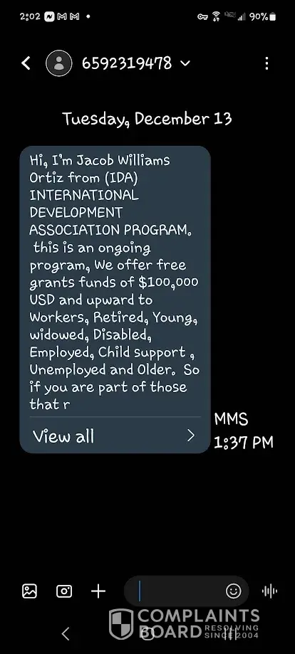 hello i recieved a text from a jacob williams ortiz said i had won a grant on a ongoing program from this commpany i have included a screenshot of the text i recieved thank you the text was recieved on tue, dec 13th 2022