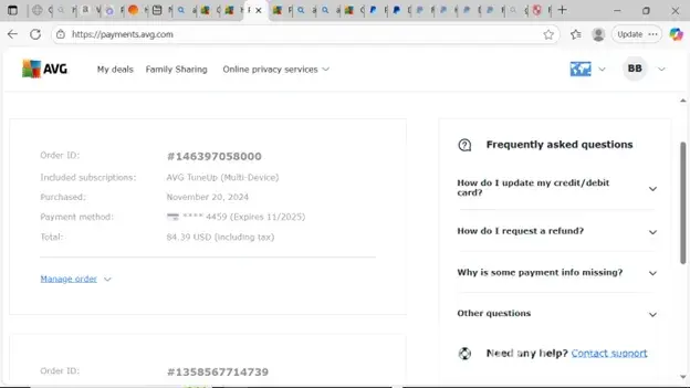 On September 18, 2025, My PayPal account was charged $64.34 for AVG PC TuneUp, Qty: 1, Product ID: [protected], Order # AGAP1638398679-1. I cancelled my subscription with AVG several months ago (see attached), and I certainly did NOT order this product. Furthermore, the AVG website shows that my last AVG purchase was November 20, 2024, and it would not have been up for renewal at this time (see attached).