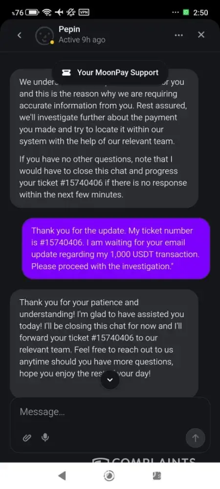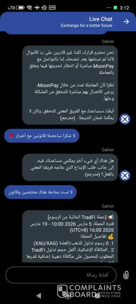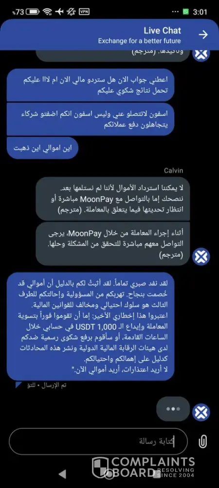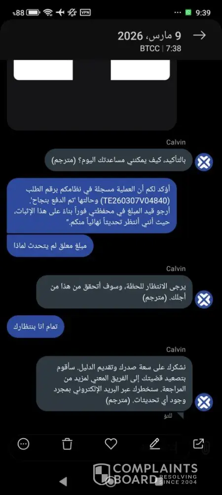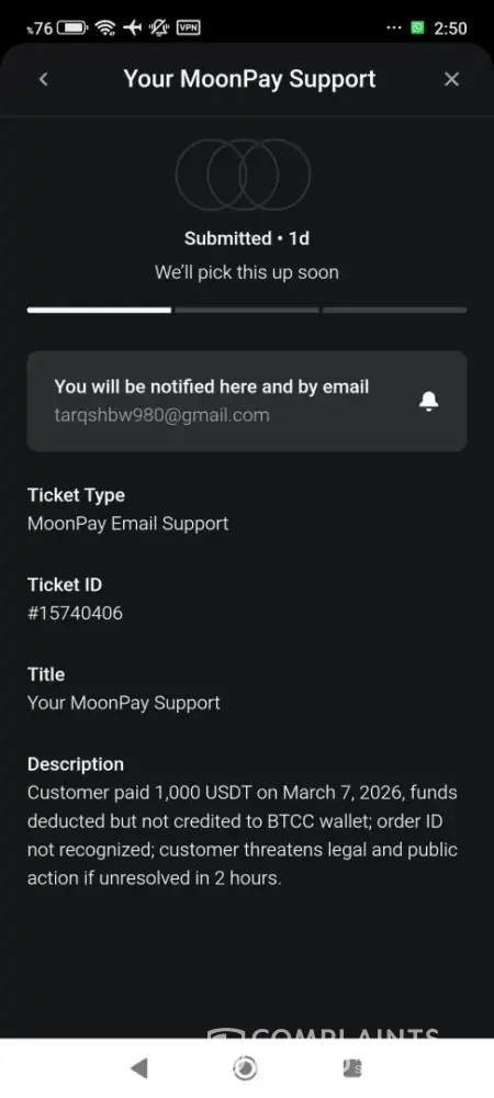 Formal Complaint: Financial Misconduct and Unauthorized Holding of Funds ​"I am filing a formal complaint against BTCC and MoonPay regarding an unresolved transaction of 1,000 USDT (Order ID: TE260307V04840). ​Despite providing full proof of payment from my bank, BTCC claims they have not received the funds and directs me to MoonPay, while MoonPay...