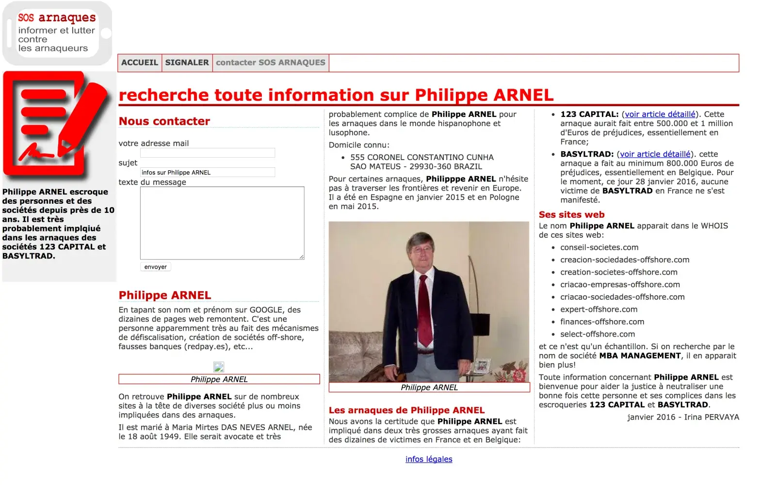 This hayder alexander rodas balcero has been raving for years in the internet scam. He would be wanted by the fbi and interpol... We find philippe arnel on numerous sites at the head of various companies more or less involved in scams. He is married to maria mirtes das neves arnel, born on august 18, 1949. She would be a lawyer and most likely an...