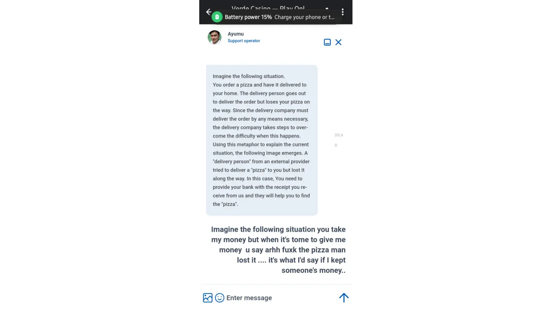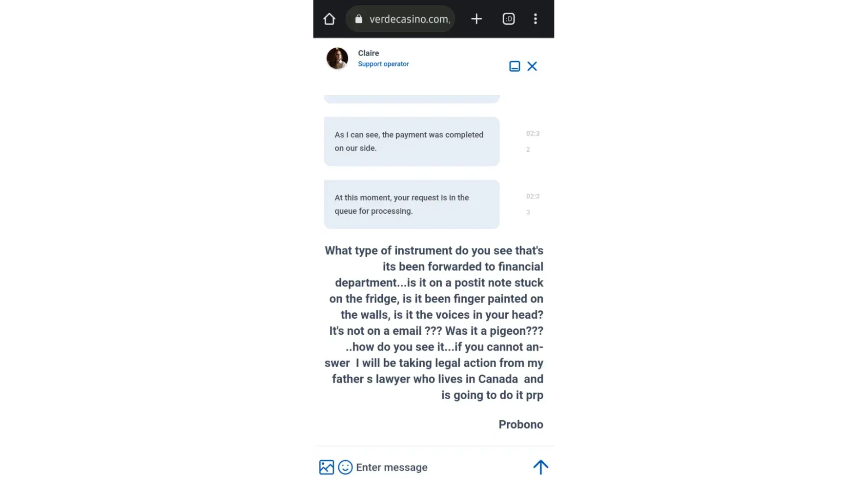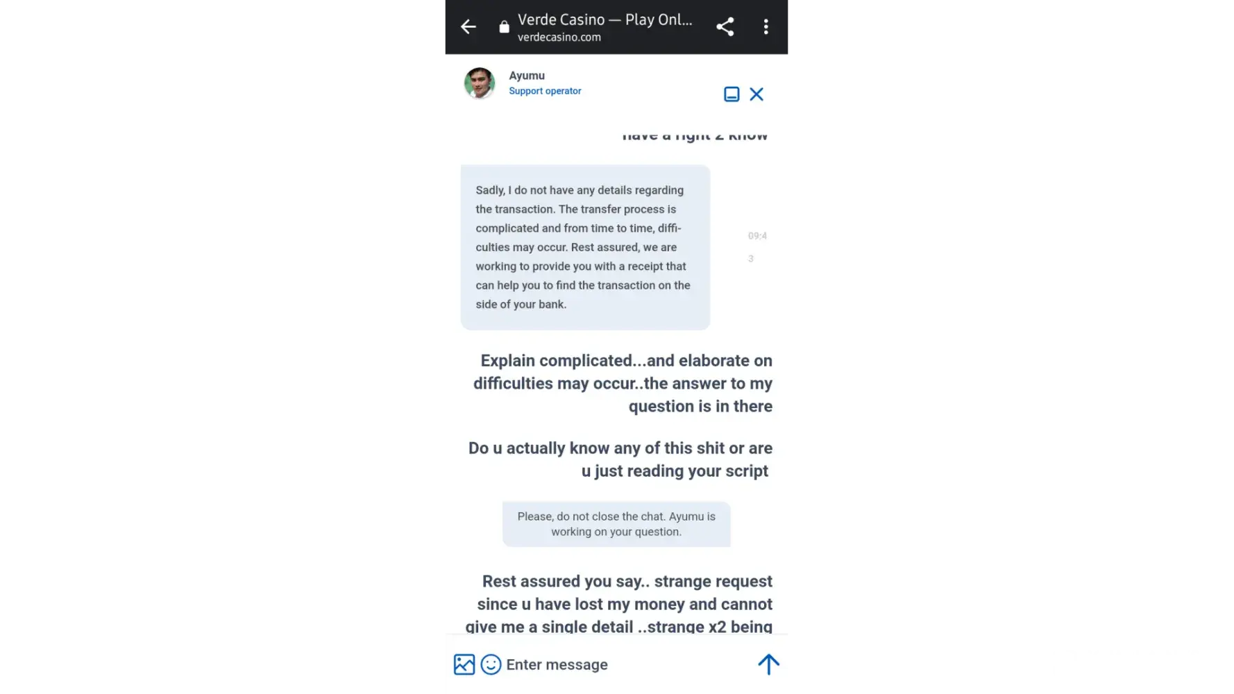Then claimed they dont have ther details yet other times they have been contacted and I need to wait... They say they can see my complaint has been forwarded to financial department then say they dont have any contact details for them?*must still be using pigeons to communicate) so how was it forwarded and what is it they mean "they can see its been forwarded if not a email... Also that its not ther financial department they have so many different providers that they dont know what's happend whos got it or where the $ is. Once or twice the reason to why I havent been paid was that there aren certain difficulties and situations that can hold my payments up but cant tell me what they are.. What my 13 +days (and counting) of screen[censored]s really expose is a very surface level very generic smooth over umbrella type"answer to all concerns a "dont worry we on the case typed answer however when question the cannot prove any facts or details on how they are helping or who is assisting them... They cannot provide me with a order number statement number invoice or anything regarding my withdrawal and bank transfer.. Ive even asked if they could send back to me my details I gave them to check for any typos I may have given but cant even do that. (again sorry to state the obvious but if they dont have my bank details how are they going to deposit.