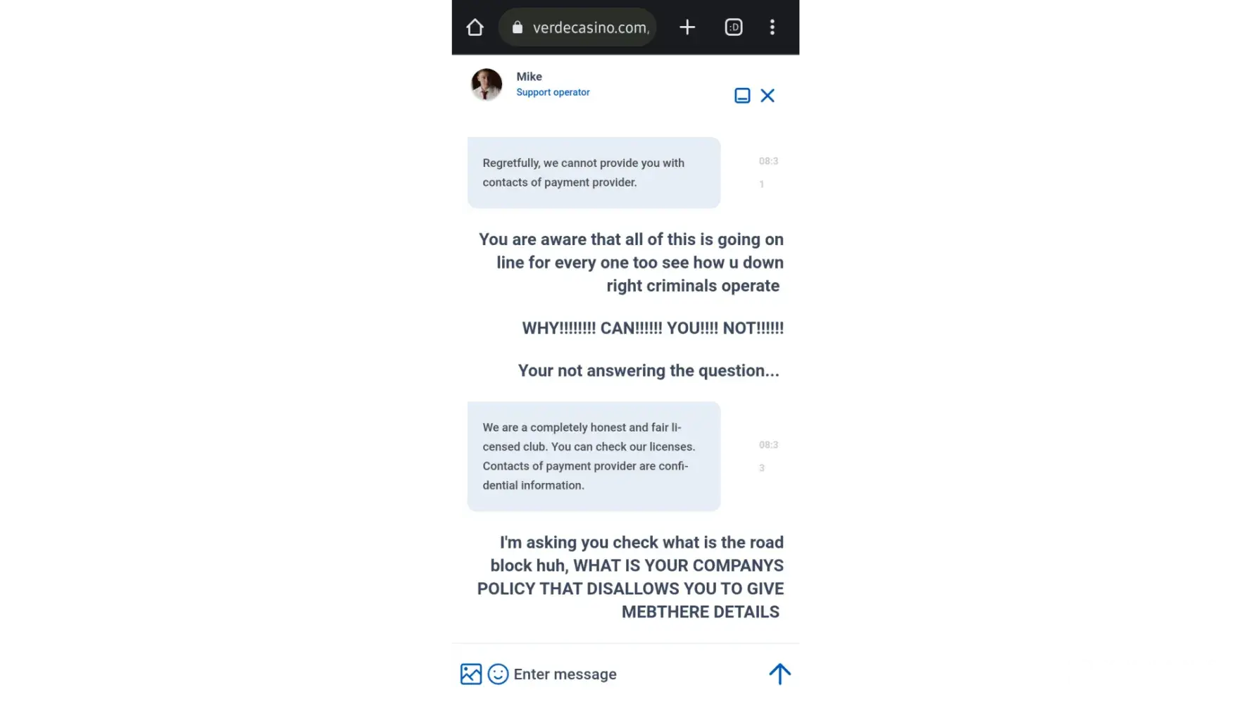 I know a thing or two about what can be devulged if your above bored and also what you have to hide and bounce around if ur all [censored]... They are showing every sign that they are fraudulent criminals doing therr very best to hide the truth and a not very good job at it. Weak scripted generic help designed to reasure and soothe us so we are more compliant and less likely to persue outside help is all they offer. What they dont, cant and refuse to say is just as important if not more important to seeing what's really going on here... If you got nothing to hide you hide nothing.. L.. I believe I can prove this as i've screenshotd most of the last 13 days or so ive3 been waiting on my withdrawal and catching on early I knew I wouldnt see any $ so decided going public is what they deserve. I made a point of cleverly constructing my questions to blow huge holes in there story tripping them up and exposing there criminal behavior at every turn to the point they only opinion was to ignore and refuse to answer and or hang up and retreat!...