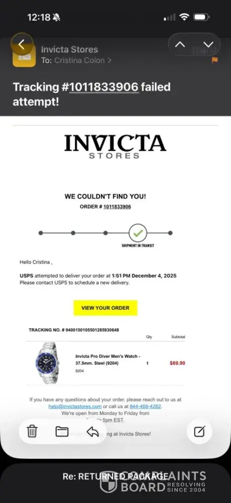 I placed an order for two watches in November, they arrived in the mail on different dates, one on December 4 and the other on December 6. The email is sent back to invicta because it does not have enough address. I have tried to contact you and sent emails and calls and have not received a response. I need to know solution for this problem. Email me [protected]@icloud.com