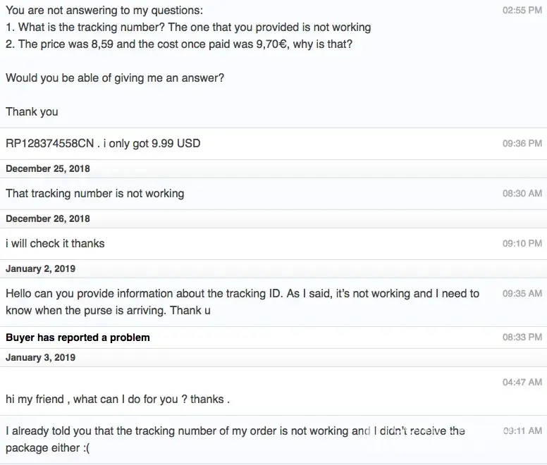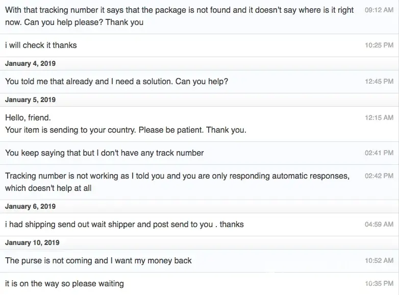 The seller has been good at communicating with me, but he never gives me any solid information. I've asked for a valid tracking number several times, but he always gives me the same one, which doesn't work. I tried to get my money back, but no one will help me. PayPal only gives you 45 days to dispute an order and get a refund, so I missed that deadline.