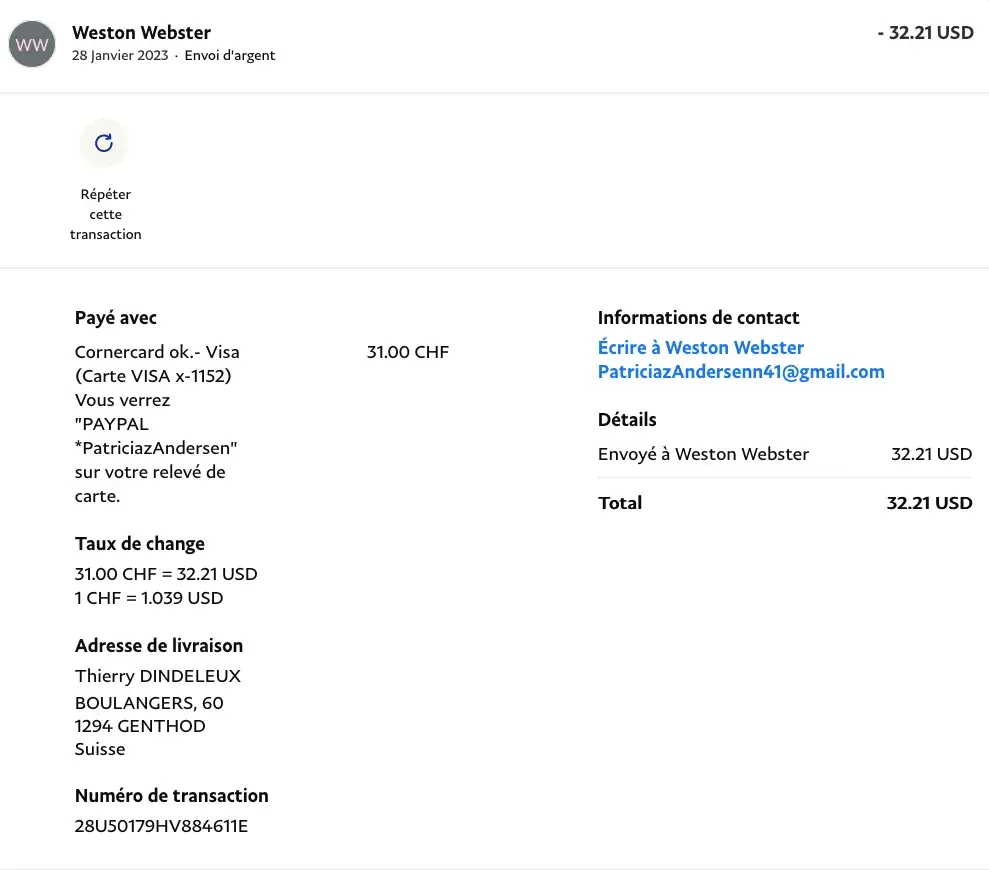 I paid 32.21 usd due to exchange rate conversion chf-usd in favour of the seller payment was sent according to information posted on ioffer for the article funds and received as per paypal confirmation but 4 days after no news at all from the seller in spite of several email-