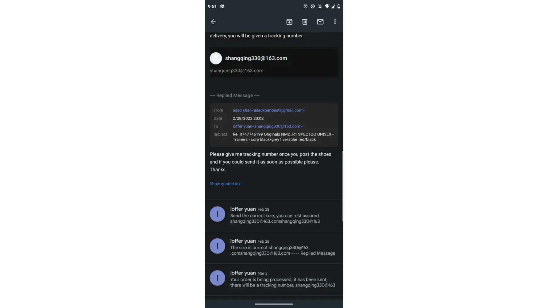 I ordered and paid for the shoes in February. I was provided with someone else's tracking number which was shipped to a totally different city and address. I followed the product tracking number and thought it was my own so I didn't know I was being ripped off with a scam until a month later when the parcel went to a different location. My product has never arrived. I have emailed the company many times and they but they have never gotten back to me after that. Now when I email them, no one replies to my emails at all. I have always been friendly and polite but it is clear that ioffer is a complete SCAM. Also be careful of anyone with the email address [protected]@163.com