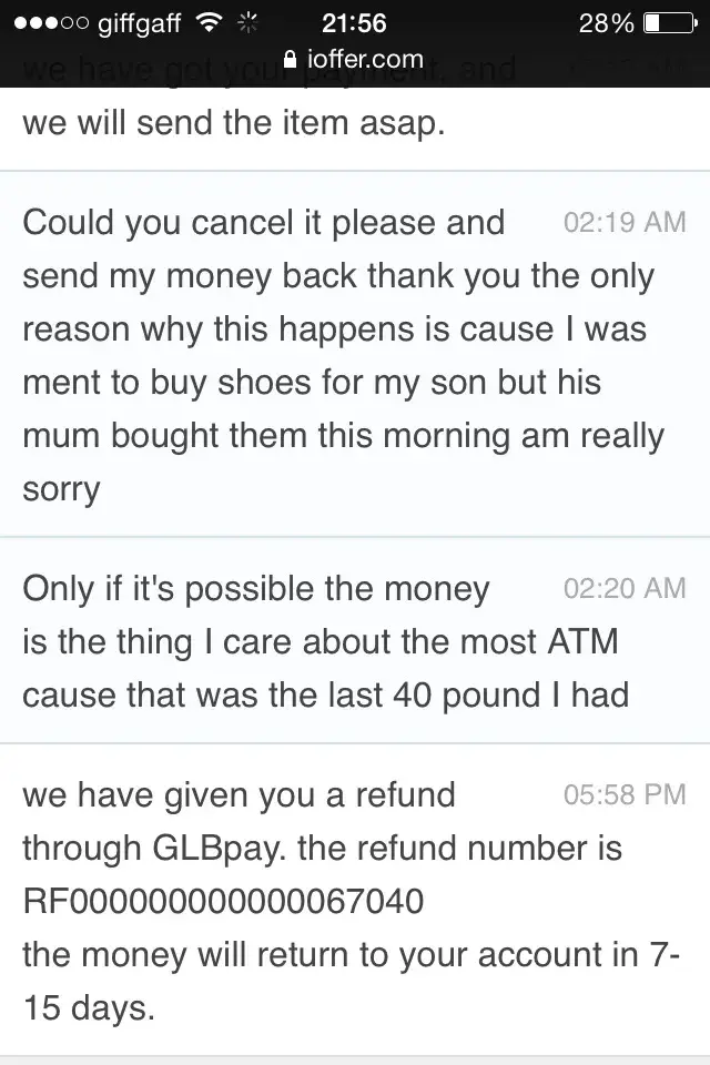 I bought 3 pair of shoes from one seller, never received my package it's been over 5 months now, they will not message me back nor give my money back, then I ordered frm another seller in the same day that I'm waiting on a package that I still have not received from them either, I have message them to refund my money but they will not.i have even contacted ioffer customers service and they are no help either telling too contact my bank, my bank can not even track this people so I know it a scam going on.i want my money back