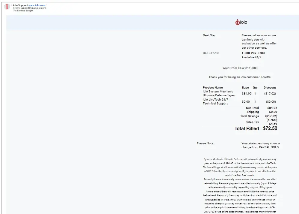 On 9/18/25 I ordered System Mechanic Ultimate Defense for $75. On 10/18/25 I ordered IOLO Updater for $21.34. Got my credit card bill on 11/18/25. I had 1 charge for $21.34 for Updater and 3 charges for Technical Support for $21.30. So unknown to me an auto pay was set up by IOLO and because I didn't read, "System Mechanic Ultimate Defense will...