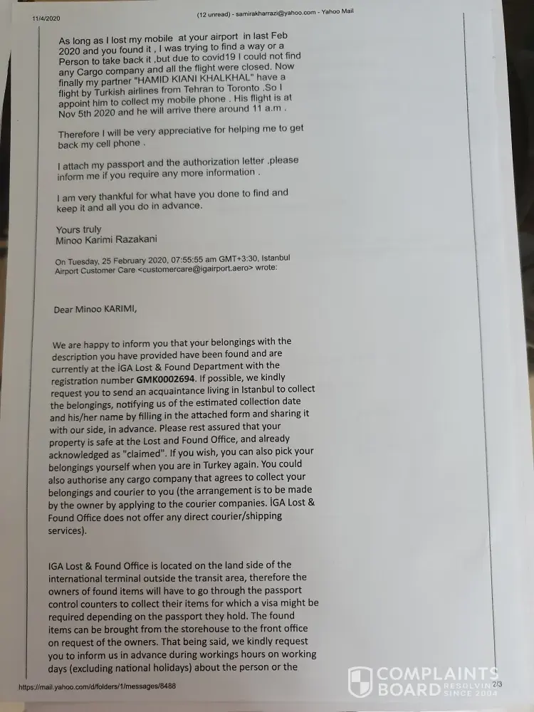 I lost my phone on 20th of last Faburary from toronto to Next destination Iran. I searched as I had about 5 hours stop but your staff declared they did not find it. In my arrival to my country I emailed to customercare@igairport. aero and they told me that they have found my phone. But due to corona I could not go or find somebody to retrieve my phone.