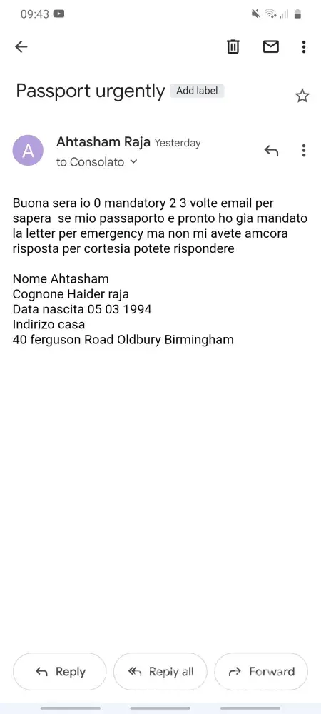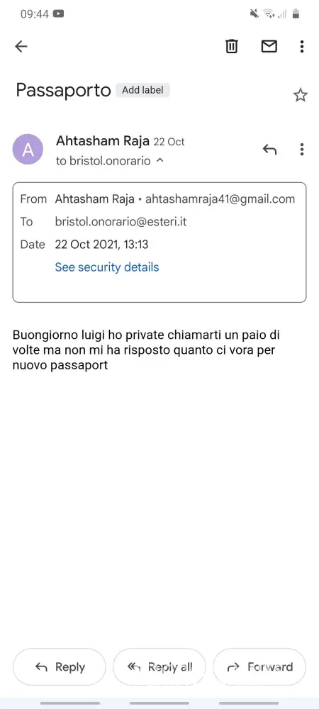 Hi I went to Bristol consolate 18 10 2021 to apply new passport and I apply urgent passport I pay fee extra and signor luigi his u will get passport in week then I send a email to him his didnt replay to me and I send loud of tex in wats up then his reply.