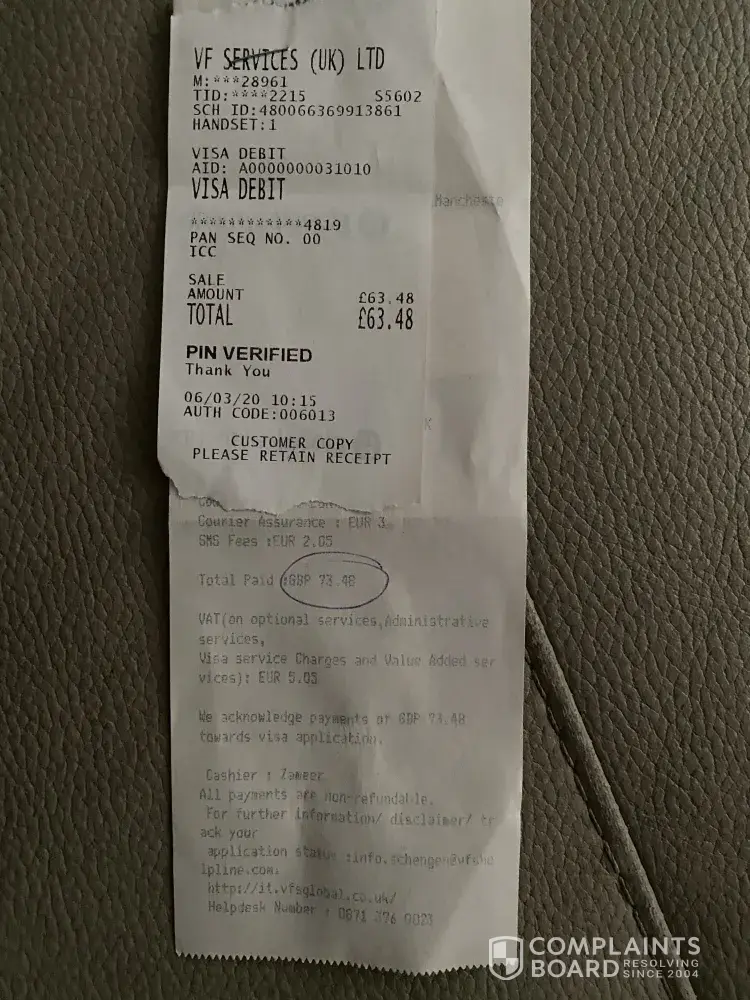 The receipt I will send additionally in the attachment. It should be 63.48£ as 10£ Which I paid online for booking my appointment were refunded.