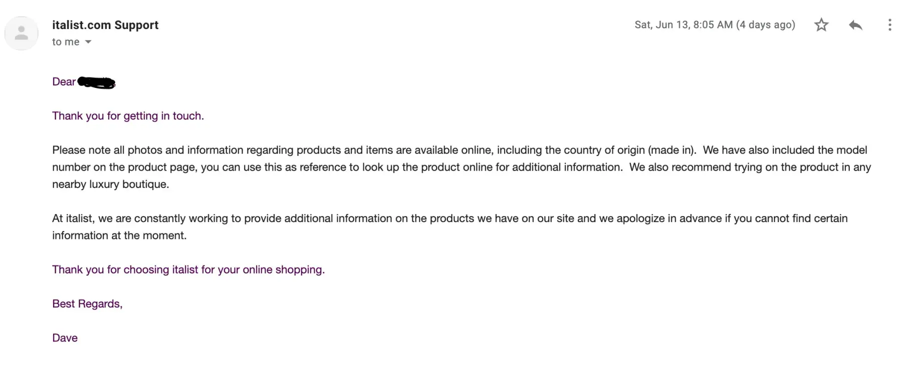 Awful customer service and no real time inventory. I ordered a dress for a wedding after cancelling my order from a more reputable store. Big mistake! It was Friday when I placed order with Italist and days went by without them confirming item was in stock. It is now Thursday and no confirmation from their Italian partner. They always send me the same canned response. It's been three full days with me messaging daily for updates and nothing from their customer service team besides the same canned cut and paste response. Now I noticed the dress is sold out on their site and the pending charge on my card dropped... So I guess they don't have it. Sad that I'm finding out this way versus an actual person. Please use 24 Sevres, Farfetch, Matchesfashion, or netaporter and learn from their amazing CS. Yes, prices may be higher but you will be able to return hassle free. Now I can't reorder from a different store as dress is sold out due to them not being able to confirm that the item was in stock. Thanks Italist. You lost a prospective customer and all you had to do was communicate honestly. Update: Finally received an email that dress is sold out and my order was cancelled 5 days after I placed it. Wow. Now it's sold out everywhere. If you really want something don't buy it at Italist. Awful company...they claim they will "get back to me" but I doubt it.