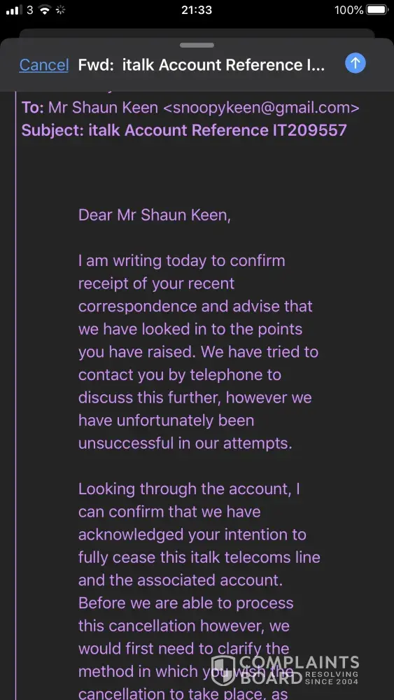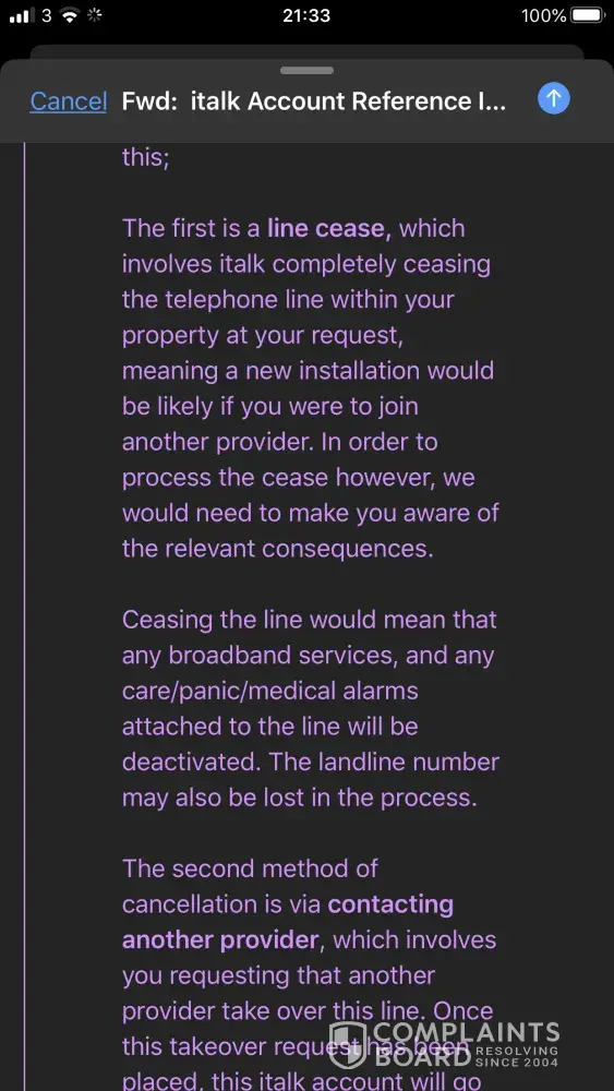 Another time of lies were another email send by italk telling me they were sorry for all the troubles I have had and the very bad internet I have been getting, they said they recognise their errors and see our correspondence and the management team have agreed to accept my complaint and to cancel this contract after I chose from one of their two ways they can cancel this contract and land line. None of their options mattered to me anyway as I had been cut off from using their broadband and phone landline for months now, although they did say the contract will be automatically cancelled if and when I get a new different network provider to take over the line. But even though I have evidence of this and all the above, the monthly bills were still coming through every month as well as the bullying reminder emails in between, higher and higher and extra hidden charges which in their policy terms and conditions state no hidden charges, yet I have proof of many, and more.