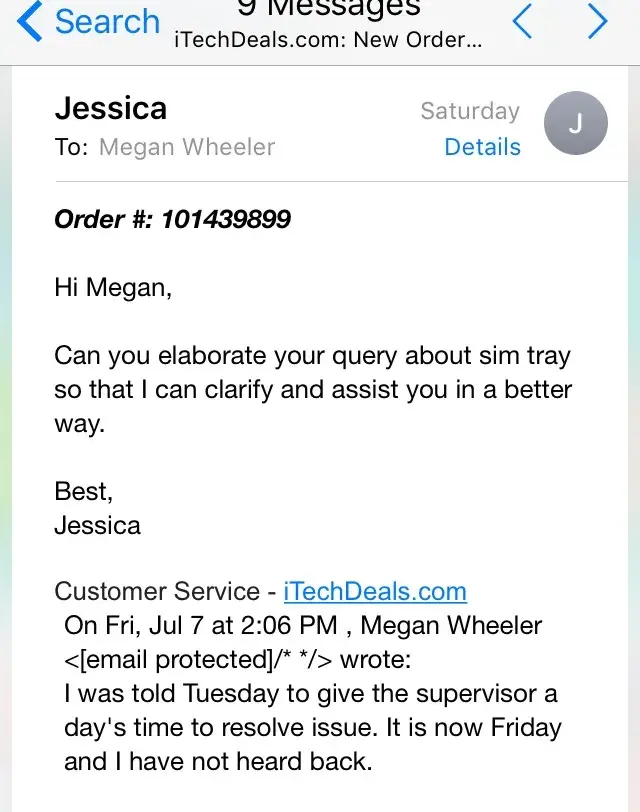 I'd like to either get confirmation from iTech for my order or cancel the order.