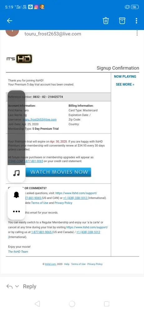 I signed up so my students could watch a relevant motion film, but after signing up, no movies, @ least not what the company advertised. So I turned to Amazon.com and paid a little money (GOOD move!). I cancelled with itsHD.com straight away. It's automated, and there is no confirmation code to jot down, no email sent to you, only faith to be had. Bad sign...