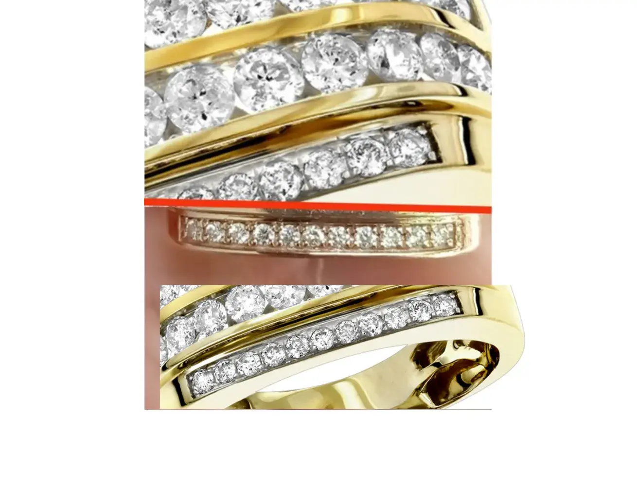 Thank you for the quick reply! Don't get me wrong. I love this ring and I am happy that I bought it. It is my favorite jewellry among all my jewellery and you have the lowest prices that I have seen. The photo that I uploaded that you refer was uploaded to show that the prongs was not white but yellow. there is another image that I have try the rings to be in the sime size when I have put 2 photos together. I am writing this because I hope that you will fix this and my perfect Jewellery store will exist. I am not completely satisfied because: