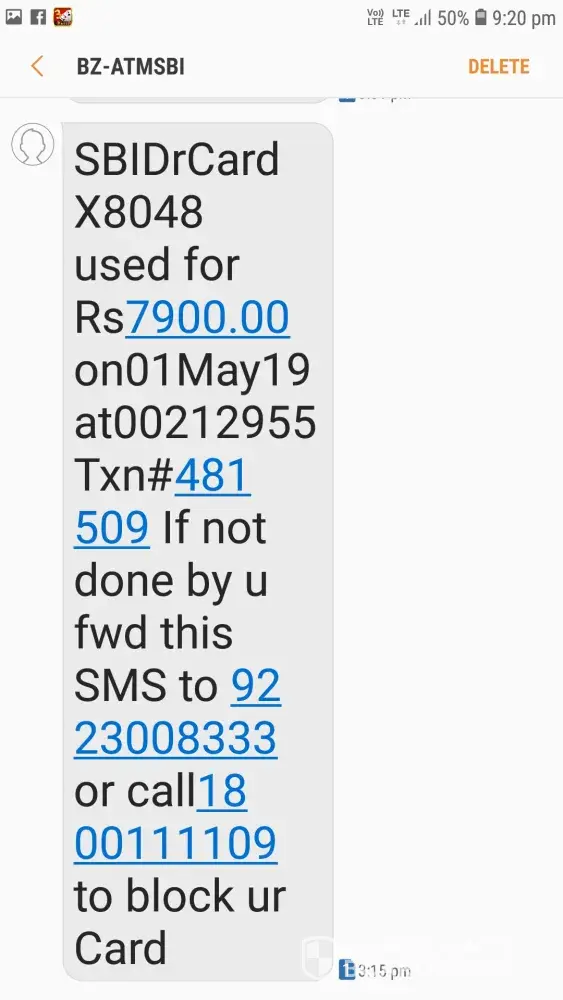 Unauthorised transaction of Rs 7900.00 on 1st of May 2019.
