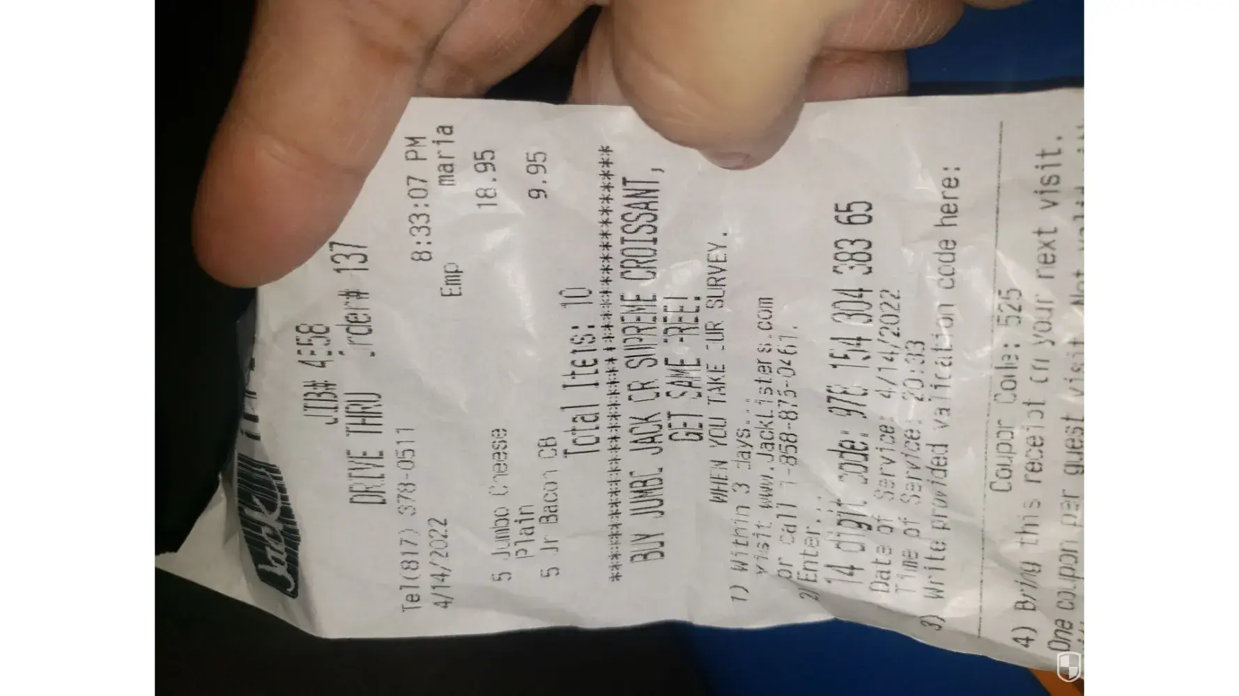 I order jr bacon cheeseburger and dont have bacon ticket#137 jib 4558 date 4/14/2022 time 8:33:07 pm