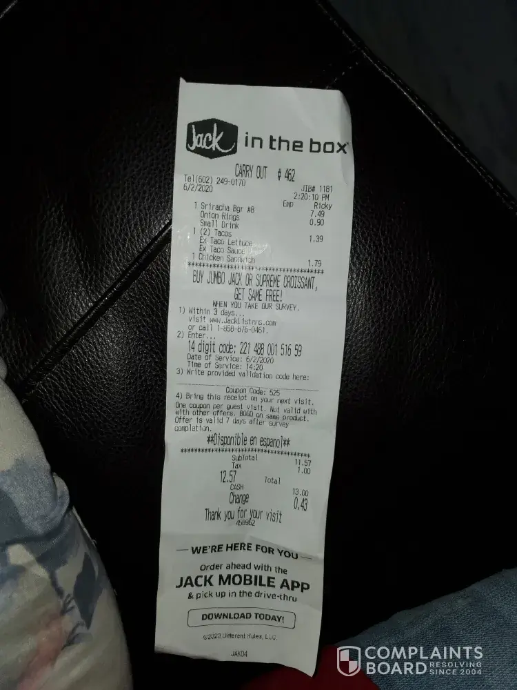 I ordered on May 15, 2020 around 9:40 pm from the drive thru 3x combos of the bbq burger and 1 combo of the triple bbq burger I spent about 30$. Well we get our food as I get home my potatoe wedges didn't have cheese or bacon. So I went back to jack in the box @ 10:20 pm which I also did not get my receipt and told them they forgot to add the cheese and...