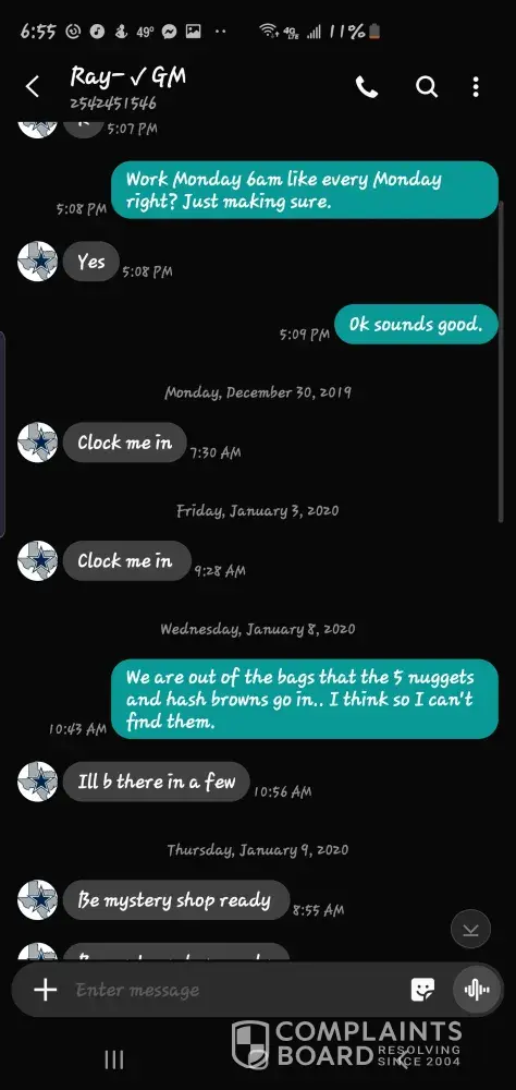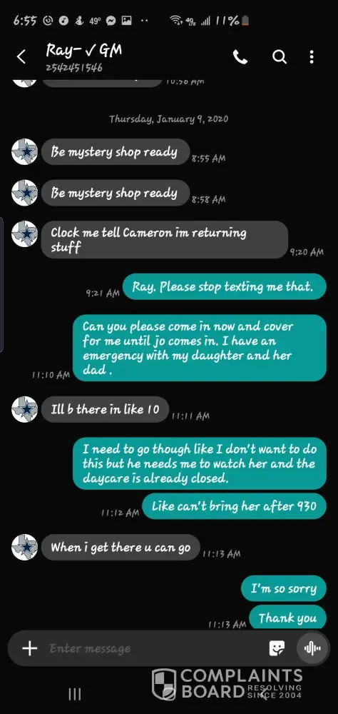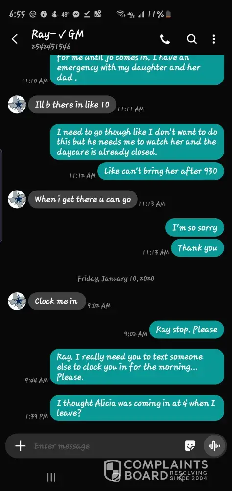 My name is Lisa Ann braasch and my GM is basically forcing me to clock him in when he isn't even at work hours before he shows up to work. I've told him that he needs to stop and he just pressures me and tells me I have to clock him in. I work at the jack in the box in harker heights Texas United States on 307 east fm [protected] my GM Raymond Cardenas. I need help being transferred or he needs to be fired I'm scared to go back to work. He is causing problems in my personal life I don't know what to do.