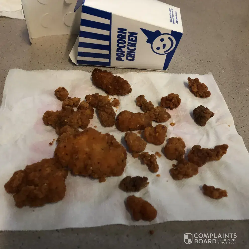Yesterday I went to get popcorn chicken and I have dried up crusty crumbles the little crumbs from the chicken in there they don't even edible there was two chicken nuggets in there and three other things then I'm guessing was the actual popcorn chicken and I took photos of the Ridiculousness that they know that they served and no one would want that I'm sure they wouldn't!