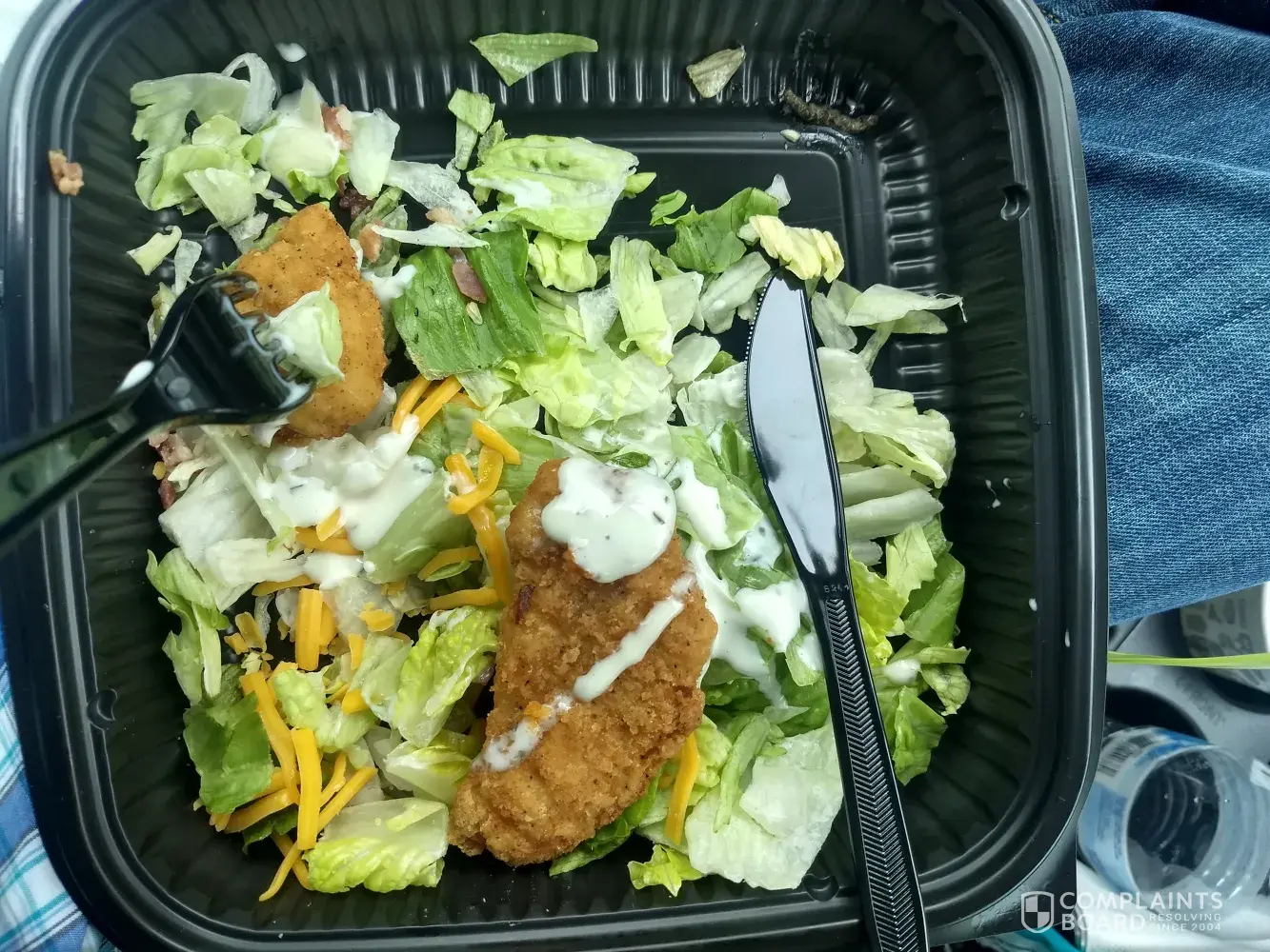 I ordered a crispy chicken salad on Postmates as well as 10piece nugget small Dr Pepper and 2 orders value fries . The salad wasn't crispy chicken it was grilled chicken, once I opened the seal it looked normal until I actually looked at it there was a piece of hair, looked like a pulled pubic hair so discusting I couldn't even eat all my food that turned...