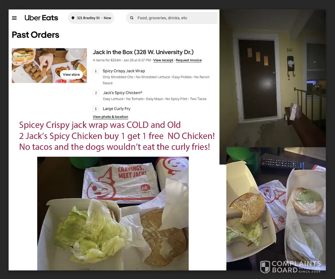 We stopped at Jack in the box and ordered at drive through and got 2 number 10s which is the spicy chicken sandwich meals and 8 tacos when we received and got back on the road we opened bag and the chicken sandwich’s was only bread and chicken no cheese, no lettuce, no tomatoes and we were short 4 tacos