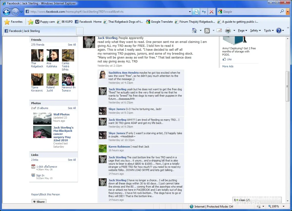Unlike you and scores of others both confused as I am about some of the low life people who have only posted negative crap about me...Mr. Jack Sterling who is living in Thailand since Oct. 10th 2003 and I report to the Thai immigration as does ALL expats living in Thailand every ninty days where I live. No one is really looking for me except to buy a Thai Ridgeback Dog. As far as breeding the TRD breed.. I have stood up to the plate always to anyone and everyone. The few people who chose the path of hurtful slander NEVER NEVER EVER speak out their names. A few have done so and I know who to steer clear of that way.. It is those who slander as if they know me but in 99% if the time they do not know me or have ever met me in person. Come to Chiang Mai Thailand and call me. [protected] has been my only phone number since I bought my first telephone in Thailand in mid OCTOBER 2003. Come visit my kennel. Come see all the TRD. Then we can go over all your mis guided comments about me and what I have done in my life since become World famous in this breed. Slander created by those who never met me or from those who claim I sent out a sick dog to whom I am wondering? Those losers are just that... LOSERS. Why do I have such a successful website that everyone keeps going to for info and to copy what they can? Count the years..MARCH 15 1994 to today AUGUST 3rd 2012 that is over 18 years... In this breed. Who can say that? OVER 500 buyers over those 18 years. Some actually bought more after their first TRD passed away.