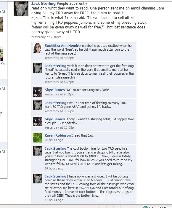 Lets see, I refused to sell you my very beautiful dog..and after I refused to deal with you you get into a I WILL KILL YOU frame of mind. Now, since you cannot have one of my TRD they all become in a flash bad quality or inbred or just no longer any good for anyone.