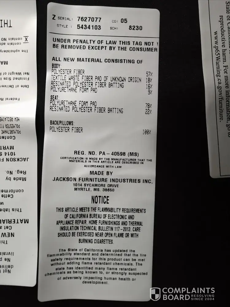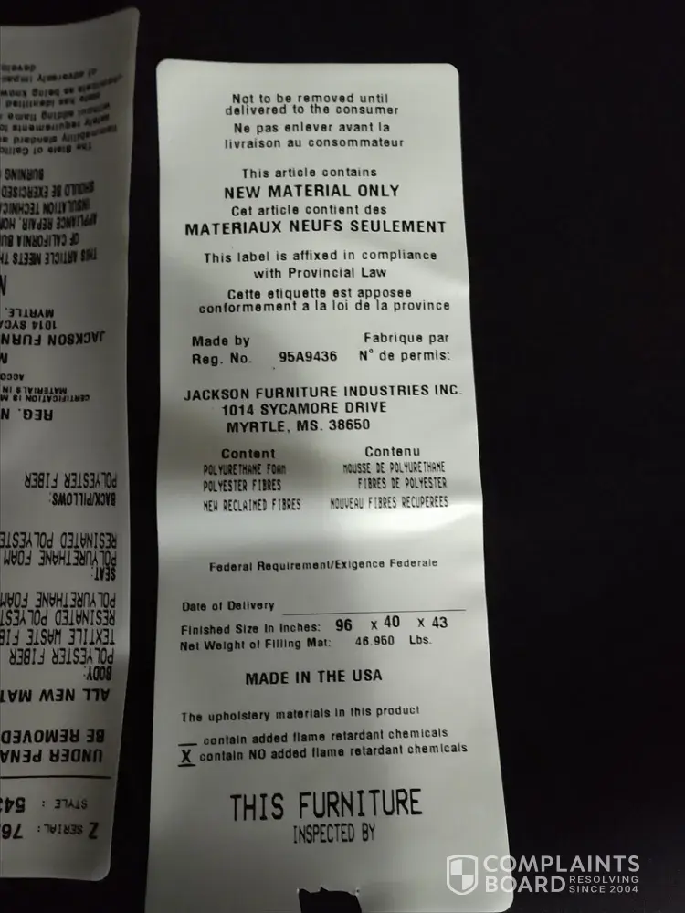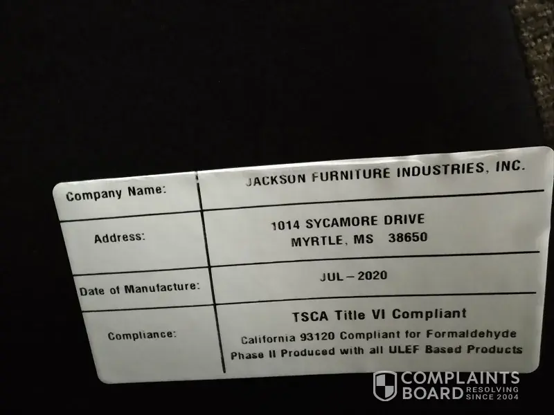 I purchased a couch and love seat manufactured Jackson Furniture / Cat napper from Conn's HomePlus in Raleigh, NC for almost $2000. The problem with the furniture is that it has a strong, very foul odor. I can taste it in the air, I smell it, it bothers my sinuses, sometimes makes my eyes water and gives me a sore throat. It was a replacement for another...