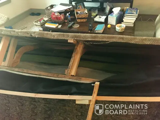 Within the past few months we have notice the stiching of our couch (where you would sit with your back against) is coming apart. We found it because the wood has broken through the stiching and when we went to sit down the corner of the wood went right into our back. Not only is the wood sticking out of the couch, but the staples in our love seat is also sticking out. It has become dangerous for us to sit on our couch and love seat without getting stabbed by a peice of wood or staple. I would be more then happy to send picture through email.