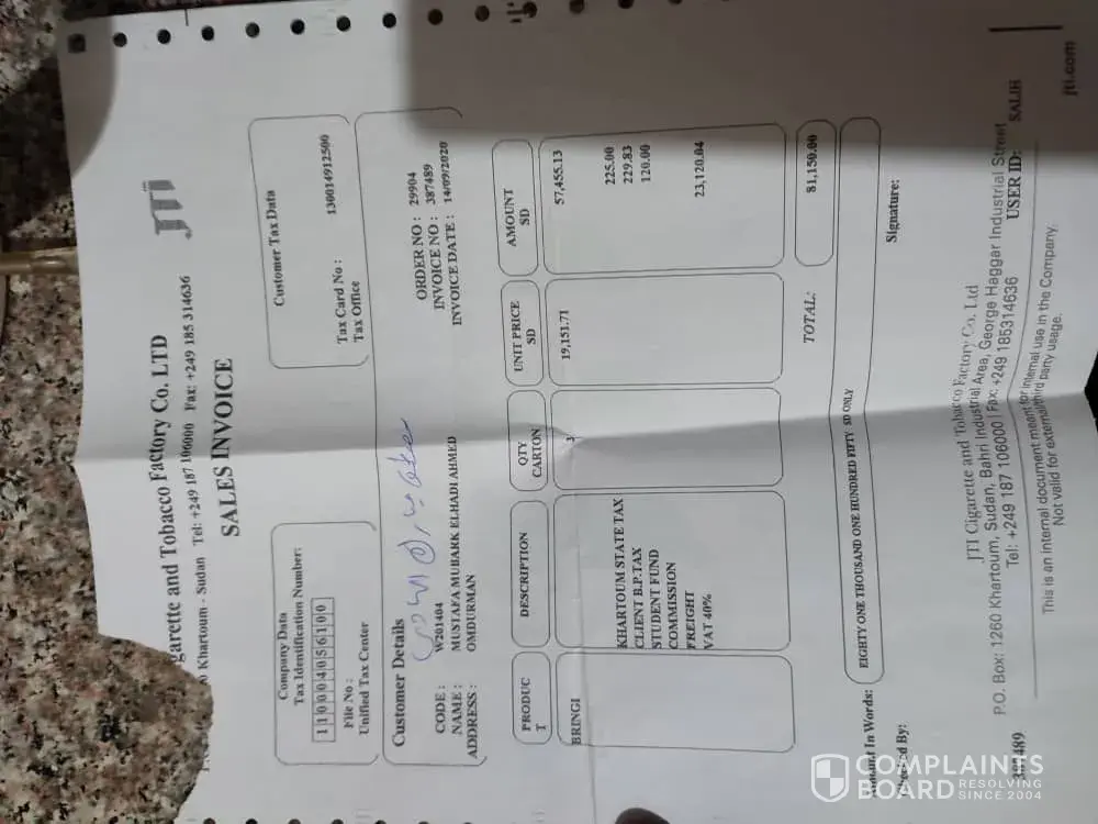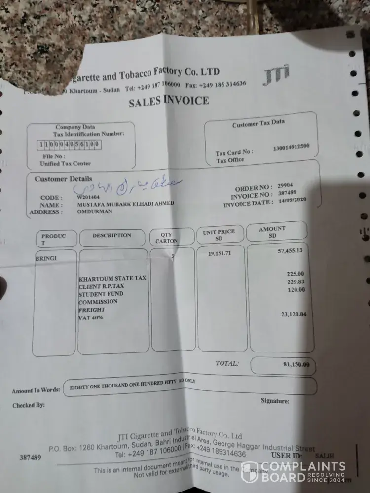 Hello, Japan Tobacco Company. If my problem is of no concern to you, please let me know. I would like to understand the meaning of compliance. your How can a company that is a global leader treat its customers this way? And is the management in Sudan simply the head office, controlling all other departments?In Africa, work has always lacked integrity. Every...