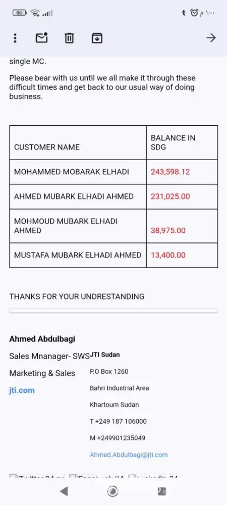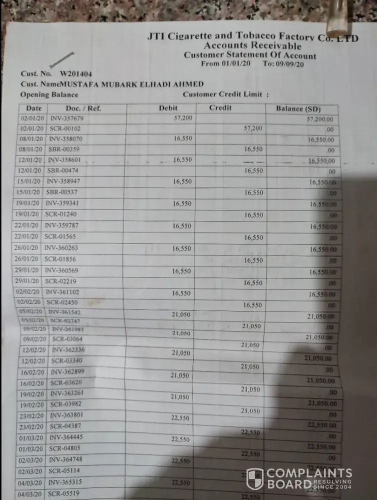 I am Mohamed Mubarak Al Hadi. I am part of the Japan Tobacco Company in Sudan branch. I was in Hajjar previously.I am Mohammed Mubarak Al-Hadi. Part of the Japanese Tobacco Company in the Sudan branch. I was previously in Hajjar. I got a power of attorney from your esteemed company. Since 2007, I have been an agent for the company for 17 years, which is not a short period in your esteemed company. I have not stopped supplying the company since this period and I have not been negligent, even the agents have not exceeded this period now I am complaining about the administration in Sudan. They did not stand with me and did not take into consideration this long period with you. The administration has not given me a share for nearly two years and no one ever responds to me.I hope that you will be kind enough to stand with me in this ordeal, and I thank you for your listening and understanding. Your distinguished agent, Mohamed Mubarak.
