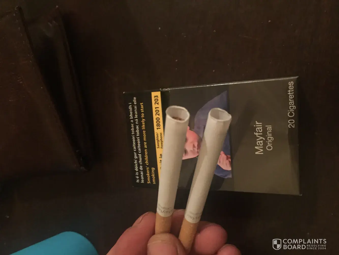 I bought a pack of Mayfair originals from Joyce's ballybane Galway today and there is only a small amount of tobacco in each cigarette I still have the pack and have pictures or these I can't smoke these as the bit of tobacco in them keeps falling out. I would like if ye could replace these as I will kept this pack till I get a reply from ye.