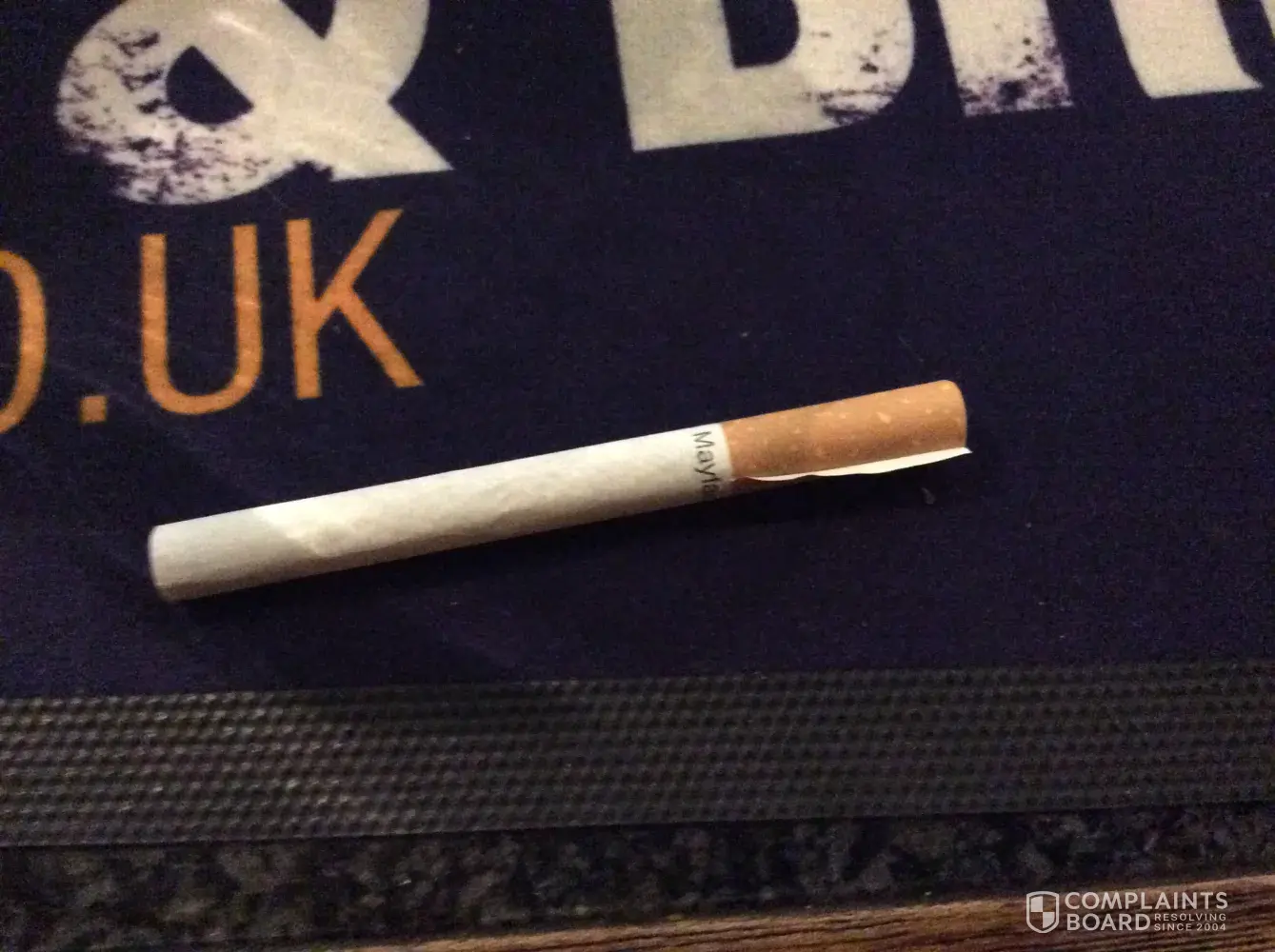After finding my cigarettes would not smoke in the normal fashion I discovered a inch long stick of wood in one. This is not acceptable with the price of your product being high I would exspect a much higher quality of product. Very disapointed to say the least. Im sure you will agree with me when I say this lets your product down and im sure this is not a isolated incident. Pls advise on you intended plan to resolve this situation. Many thanks. M thompson