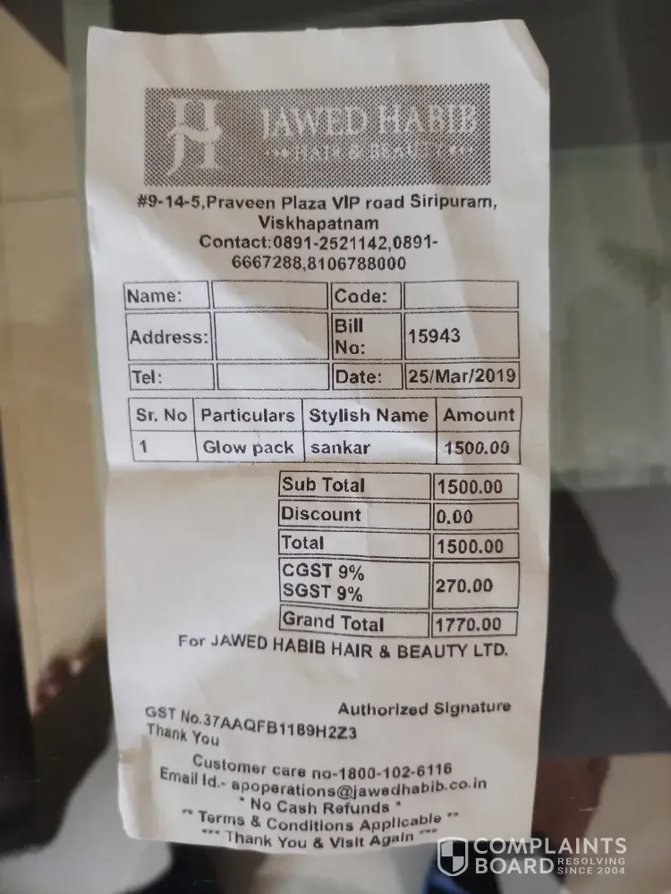 Dear Sir, I had taken an appointment for JAWED HABIB, siripuram branch, vizag for Glow pack to attend my marriage meeting. I thought it's Branded saloon and went there with some hope. Went to Jawed Habib Branch location mentioned below. I went at around 8.30 pm night and they told it's closing time but said that they can finish the pack. I was taken...