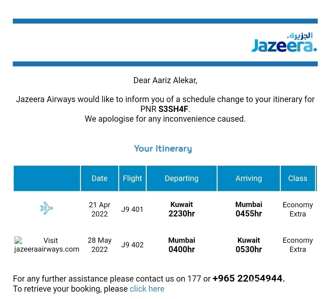 Jazeera Airways Reschedule of flight