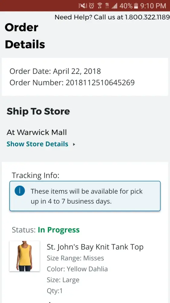 I ordered tank tops online on the 22nd. It is now the 3rd. My odrer is still not at the store and no one will help determine where it is. Online says pick up at store which I chose be 4-7 business days. Today is 8/9 business days. I even called the store and contacted them via Twitter. I keep gettimg the same answer. Your order is not at the store.