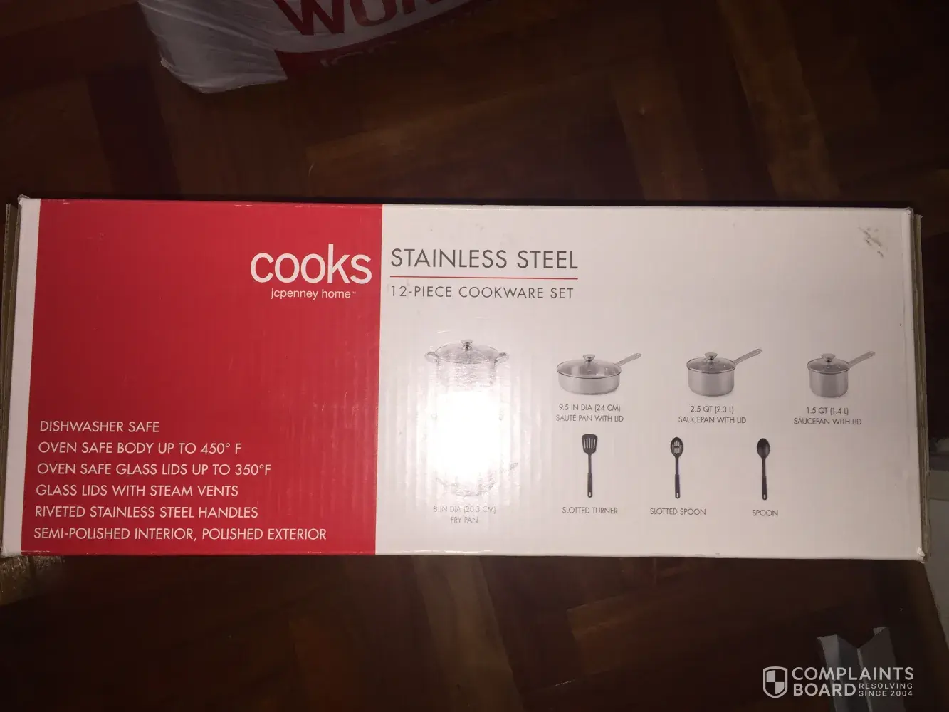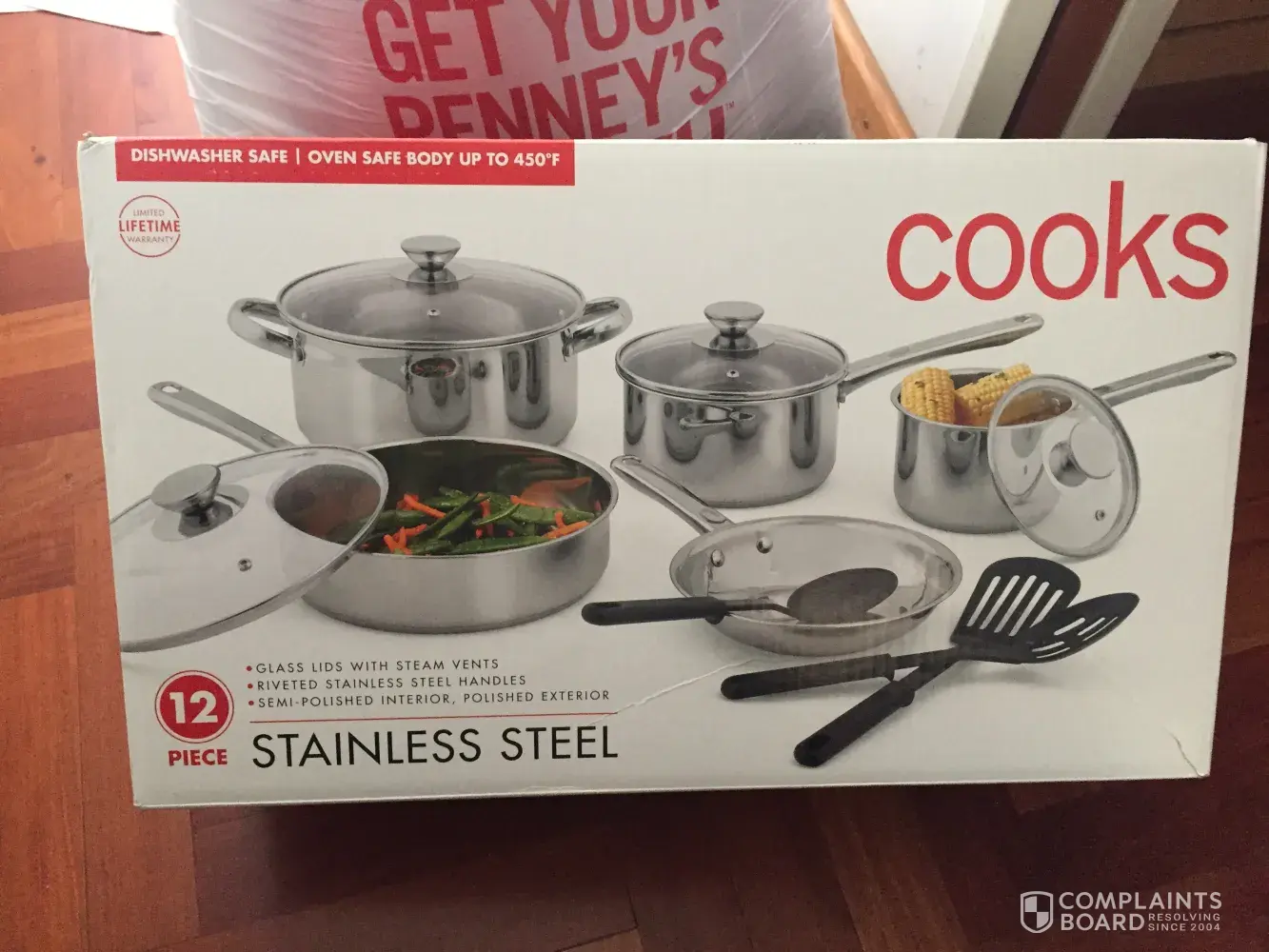 The 1/7/2018 at miday I bought at the Manhattan Mall a 12 pice cookware stainless set Cooks JC Penny Home.