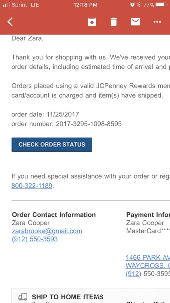 I placed and order on 11/22/17 for three women's tops. I received a phone call from a woman in Sonoma, CA that she had received my order. Somehow my shipping city and billing city got changed on my order. When I checked my account it has my correct address for both shipping and billing. I contacted JC Penney and talked with customer service. I contacted customer service at JC Penney and the rep Jenn told me I had to of changed the city when I ordered. I told her why would I do that? She stated she didn't know. I told her all of my information was correct on my account. I also stated it sounds to me like there is a glitch in their system. I asked her how I can get my package redelivered to the correct address? She told me I had to contact UPS and have them redirect it. I contacted UPS and they told me she gave the incorrect information. JC Penney has to submit a claim to have my package redirected. I had already spent one hour trying to get through to JC Penney and another twenty five minutes to get through to UPS.