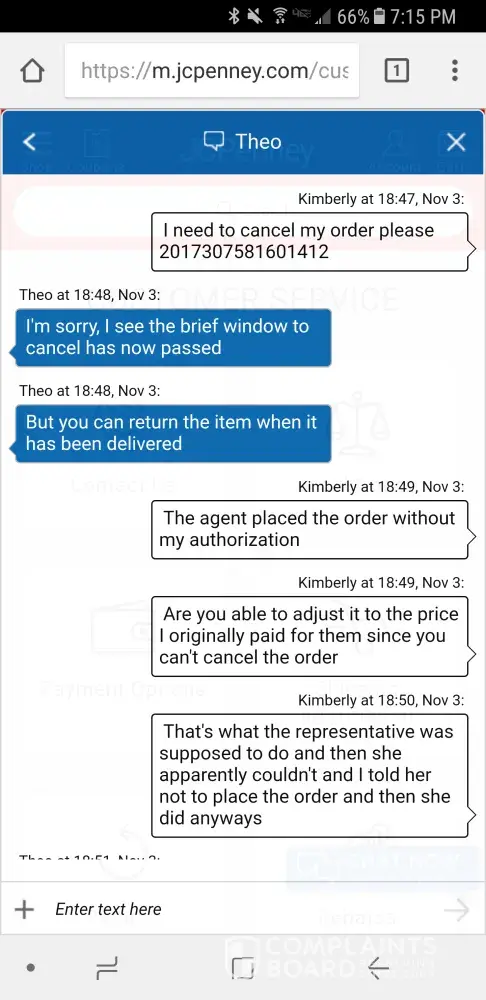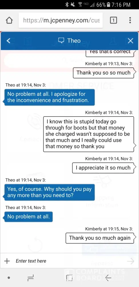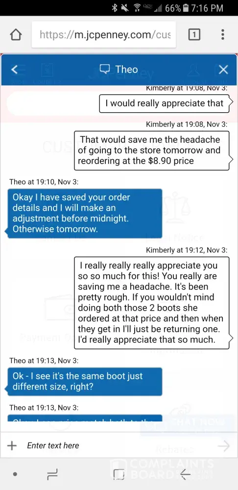I talked to a gal last night and was re ordering a pair or boots I ordered that didn't fit. After asking for the last 4 of my card on the back, she then told me she could not adjust the price for the boots I originally paid even though it was a reorder. I told her not to place the order and received an email stating she placed it. My account was withdrawn $100 from it when I originally paid less than $10 for the boots. I called customer service 10 min after and they said they couldn't cancel the order. I then spoke to Theo on JC Penny chat and he said he could adjust the price last night. I called customer service this morning and they said he hadn't adjusted it nor could they. I'm pretty upset with customer service over the phone and how I've been treated. My local store is always very nice and helpful but not customer service when I call in. I will not be recommending JC Penny or shopping anymore there.