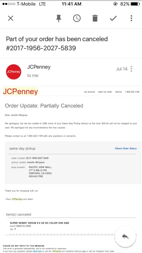 I ordered items online [protected]) using same day pickup in store on Saturday July 29th at 8:05pm. I received a text message on Sunday July 30th at 12:58pm stating items from my order had been canceled. I check online and it was 2 navy blue Izod boys performance polo shirts because they were out of stock. It would have been nice for someone from the store to call me and give me options such as picking the shirts up from another store that had them in stock.