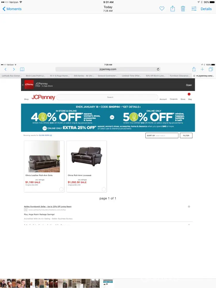 I tried to purchase online, three (3) of these sofas at 7:30 AM on 1/17/2017. The sale price shown on your website was $1180.00. When I added the 3 sofas to my bag it showed a price of $2360.00. I used the 40% off (Shop44) and I received the discount but I did not receive the sale price advertised. I called the chat line and they informed me there was nothing they could do . The sale was over . I told them I had a screen shot of the sale price and the sale date ending 1/18/ 2017. I asked for an email address to forward the screen shot to. No email. BUT, I could include the screen shot in my chat. I told her that I would have to come off of my iPad and use my computer in order to do it. I also asked how to get the chat started again. She said just start another chat. Thanks for using JC Penney.