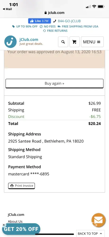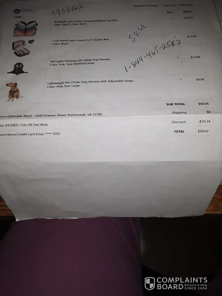 11/23/20: On Sept. 8, 2020 (small order-4 items) and again on Sept. 30, 2020 (lg. order-20 items) I ordered & paid $534.98 for a total of 24 items from ''jclub.com' Company. Order #'s are: 2243839, 2254679, 2243853, 2254738, & 2254704. It is now Nov. 23rd, & only 3 items ($84.99) of the original 24 have been delivered to me as of this date. Since mid-Oct. to today, I have sent 3 separate E-mails with no response, & called their Customer Service # 4 times (including today). Each time, I was put on 'hold' for 35-45 mins. then got 'disconnected'. I tried their 'contact us' email, no response, then phone #, & an 'auto message' transferred me to C/S, put on 'hold' then 'disconnected' again. The package that 'did' come had no return address or company info. at all. To date, I do NOT have $479.00 of merchandise I have already paid for! I believe I have been Scamed by this website. I attached copies of my 'documentation' to this message.